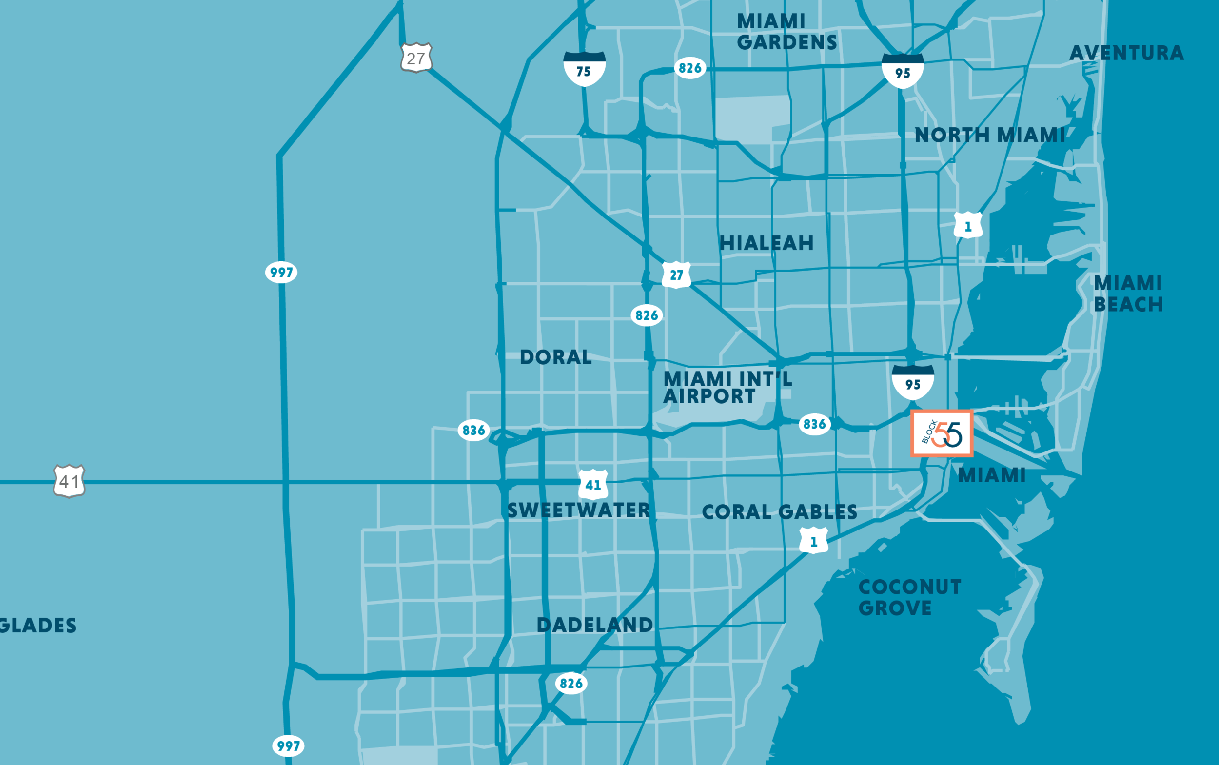 From Miami International Airport, take the Dadeland South Station train to the Historic Overtown/Lyric Theatre Station, exit station and walk one block west to Block 55